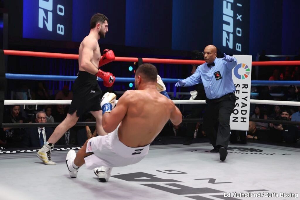 LAS VEGAS, NEVADA – FEBRUARY 15: Umar Dzambekov knocks out Ahmed Elbiali in a light heavyweight bout during the Zuffa Boxing 3 event at Meta APEX on February 15, 2026 in Las Vegas, Nevada. (Photo by Ed Mulholland/Zuffa Boxing)