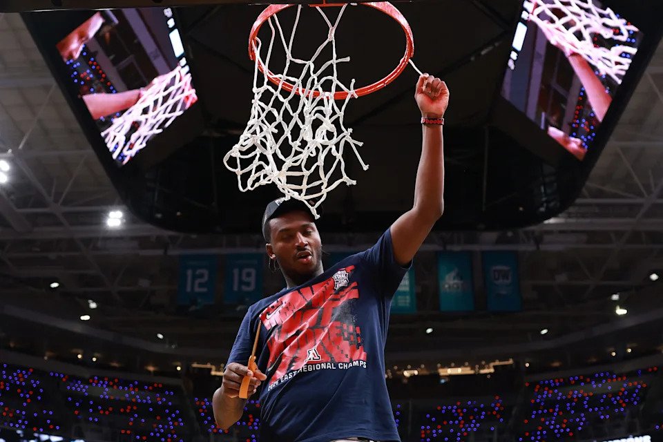 Ivan Kharchenkov #8 of the Arizona Wildcats cuts down the net after defeating the Purdue Boilermakers 79-64 in the Elite Eight of the 2026 NCAA Men’s Basketball Tournament at SAP Center on March 28, 2026 in San Jose, California.
