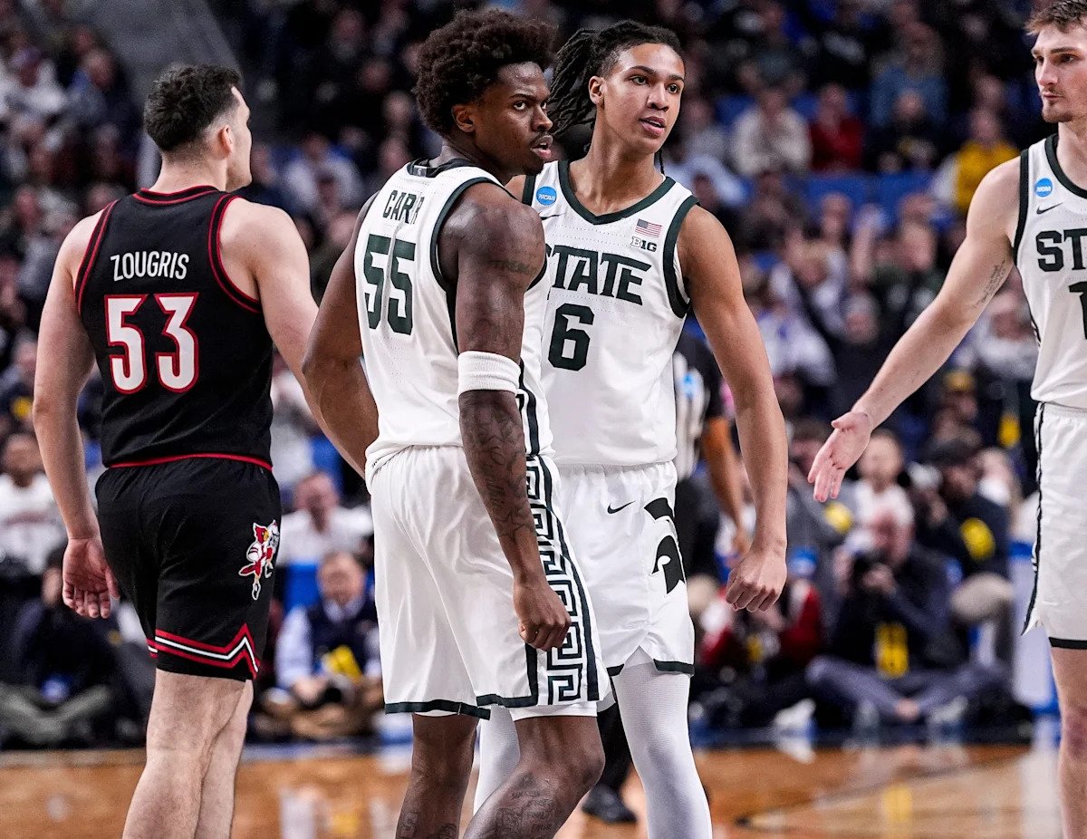 Michigan State forward Coen Carr (55) and forward Jordan Scott (6) celebrate a play against Louisville during the second round of the 2026 NCAA men’s tournament at KeyBank Center.