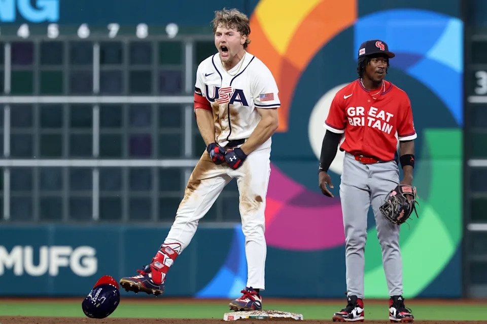 United States shortstop Gunnar Henderson (11), right fielder Roman Anthony (3) and center fielder Pete Crow-Armstrong (4) celebrate after the game against Great Britain at Daikin Park.