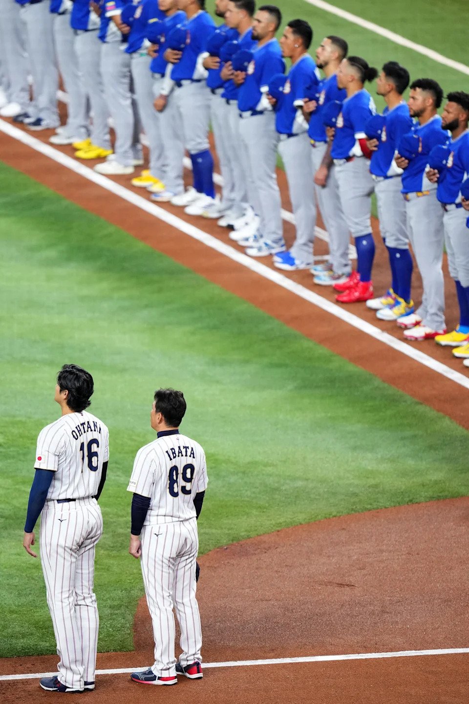 Japan and Venezuela players line up for anthems.