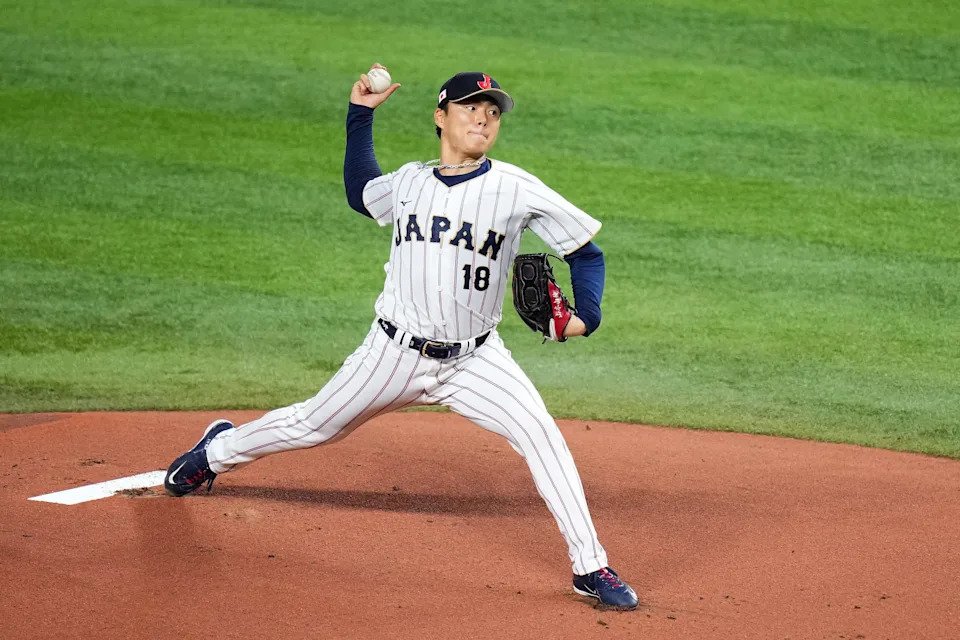 Japan’s Yoshinobu Yamamoto pitches in the first inning.